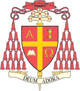 The symbol above the coat of arms of a red galero (wide-brimmed hat) with 15 tassels on each side, is a widely-recognized indication of a cardinal, commemorating the tradition (prior to Second Vatican Council) of the Pope's presentation of a red tasseled galero to new cardinals.The golden metropolitan cross behind the shield signifies Cardinal Collins' position overseeing an archdiocese (a metropolitan see).